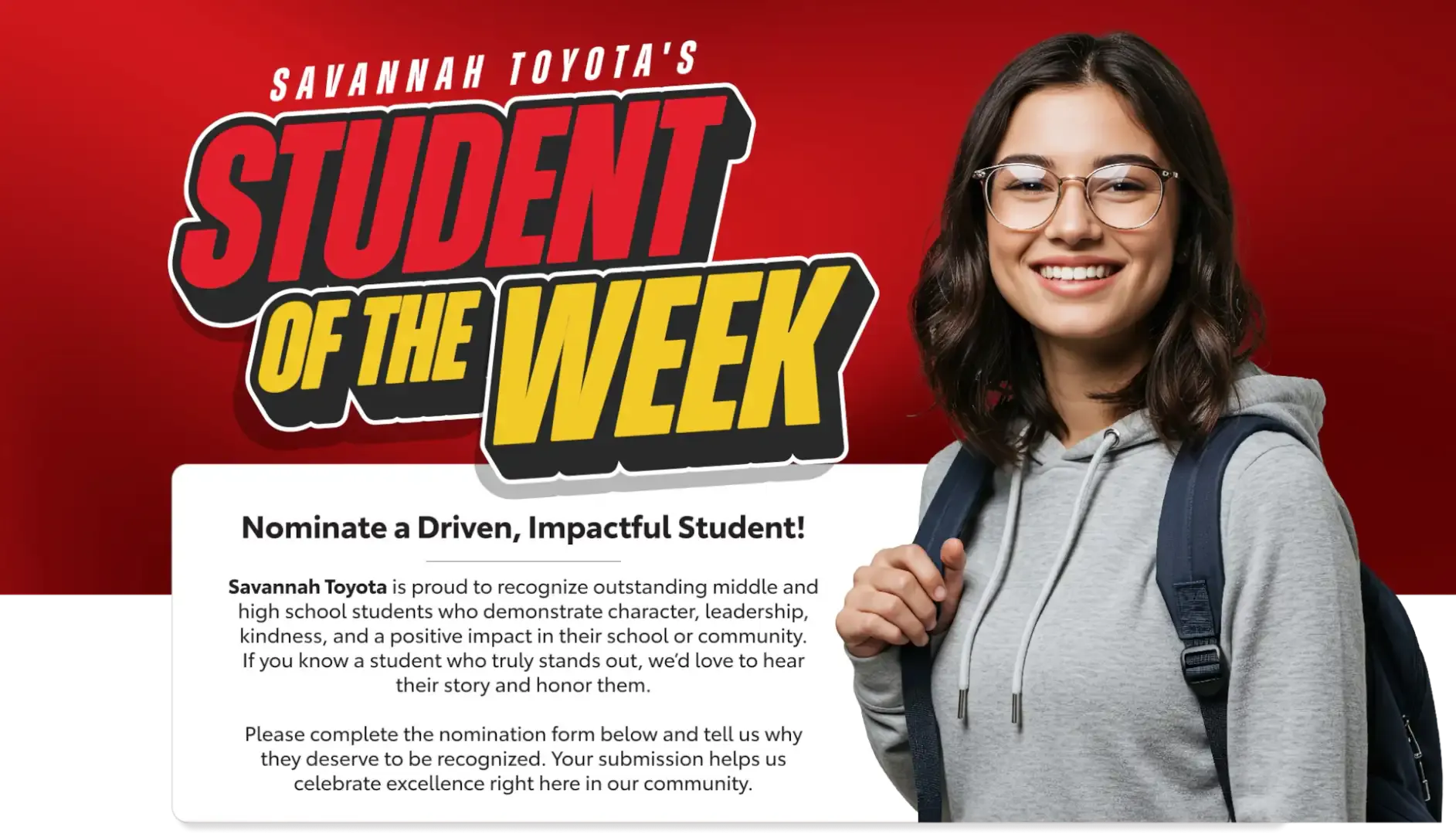 Savannah Toyota’s Student of the Week program highlights students making a difference in our local community. Use the form below to nominate someone who deserves recognition.
