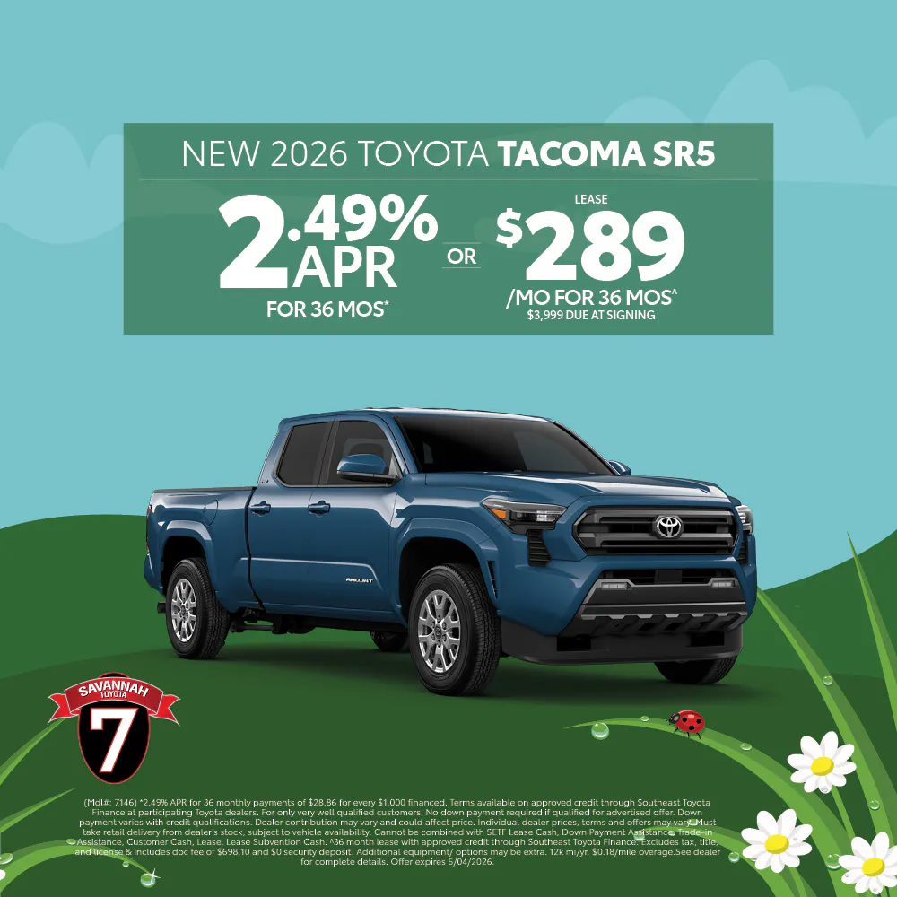 (Mdl#: 7146) *2.49% APR for 36 monthly payments of $28.86 for every $1,000 financed. Terms available on approved credit through Southeast Toyota Finance at participating Toyota dealers. For only very well qualified customers. No down payment required if qualified for advertised offer. Down payment varies with credit qualifications. Dealer contribution may vary and could affect price. Individual dealer prices, terms and offers may vary. Must take retail delivery from dealer's stock, subject to vehicle availability. Cannot be combined with SETF Lease Cash, Down Payment Assistance, Trade-in Assistance, Customer Cash, Lease, Lease Subvention Cash. ^36 month lease with approved credit through Southeast Toyota Finance. Excludes tax, title, and license & includes doc fee of $698.10 and $0 security deposit. Additional equipment/ options may be extra. 12k mi/yr. $0.18/mile overage.See dealer for complete details. Offer expires 5/04/2026.