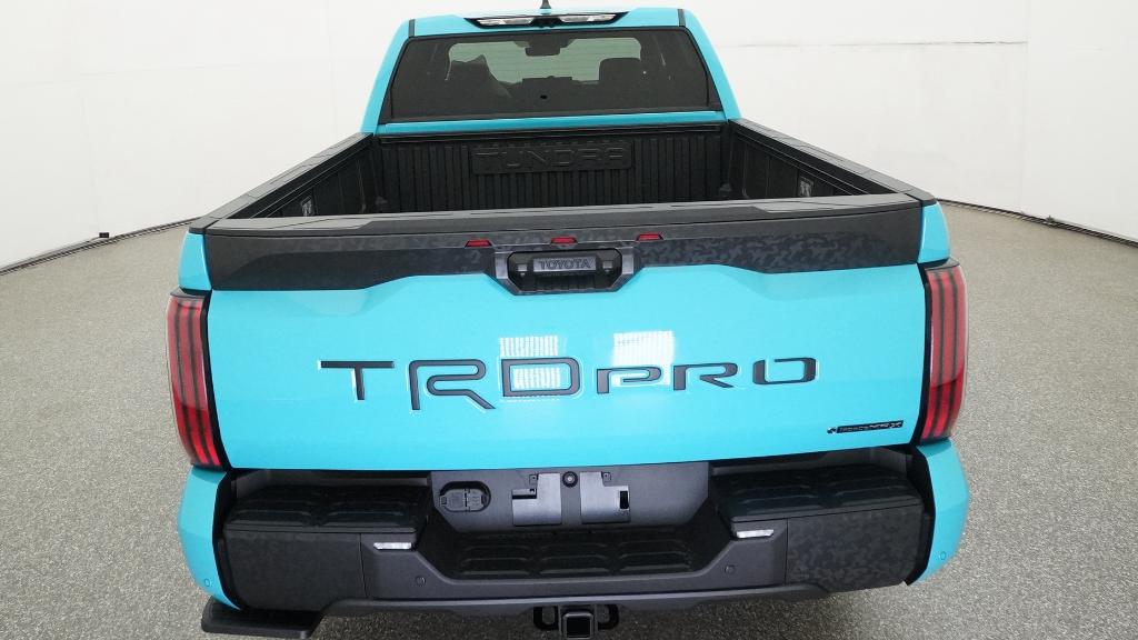 - "TRD PRO" hood badge; black door handles; black window molding and mirror caps; black technical-camo-grained tailgate spoiler and overfenders with marker lights
